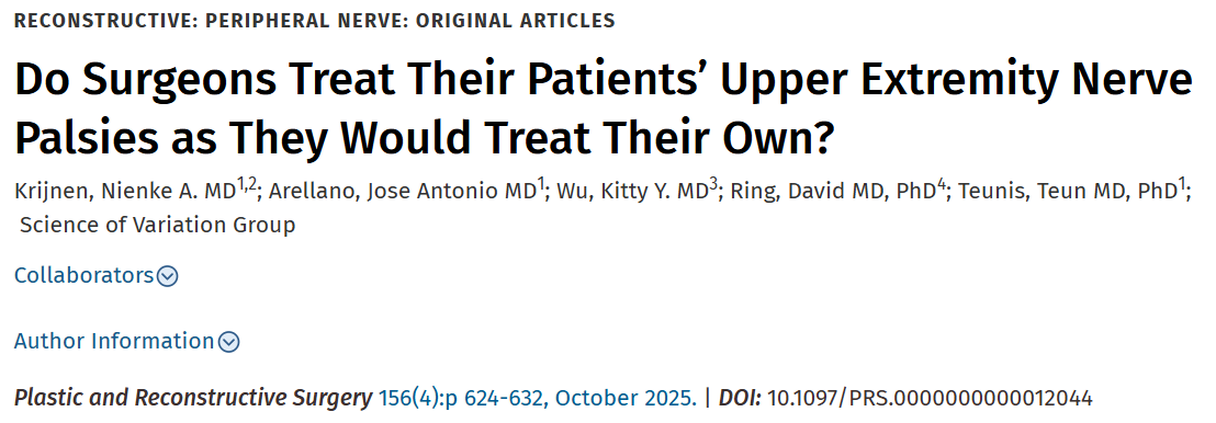 Dr. Teunis' paper, "Do Plastic Surgeons Treat Their Patient's Upper Extremity Nerve Palsies as They Would Treat Their Own?" selected as the PRS Editor's Pick for October.